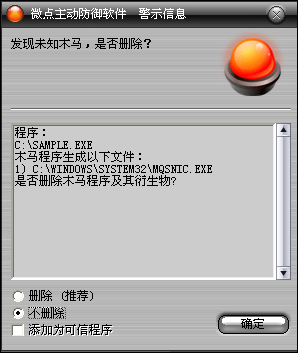 如果您已经将微点主动防御软件升级到最新版本,微点将报警提示您发现木马"Backdoor.Win32.Small.a”,请直接选择删除(如图2)。