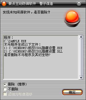 已安装使用微点主动防御软件的用户,无须任何设置,微点主动防御将自动保护您的系统免受该病毒的入侵和破坏。无论您是否已经升级到最新版本,微点主动防御都能够有效清除该病毒。如果您没有将微点主动防御软件升级到最新版,微点主动防御软件在发现该病毒后将报警提示您发现“未知间谍”,请直接选择删除处理(如图1)