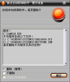 已安装使用微点主动防御软件的用户,无须任何设置,微点主动防御将自动保护您的系统免受该病毒的入侵和破坏。无论您是否已经升级到最新版本,微点主动防御都能够有效清除该病毒。如果您没有将微点主动防御软件升级到最新版,微点主动防御软件在发现该病毒后将报警提示您发现“未知间谍”,请直接选择删除处理(如图1)