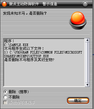 已安装使用微点主动防御软件的用户,无须任何设置,微点主动防御将自动保护您的系统免受该病毒的入侵和破坏。无论您是否已经升级到最新版本,微点主动防御都能够有效清除该病毒。如果您没有将微点主动防御软件升级到最新版,微点主动防御软件在发现该病毒后将报警提示您发现“未知木马”,请直接选择删除处理(如图1)