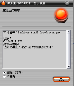 如果您已经将微点主动防御软件升级到最新版本,微点将报警提示您发现木马"Backdoor.Win32.GreyPigeon.ynt”,请直接选择删除(如图2)。