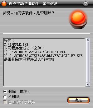 图1 微点主动防御软件自动捕获未知病毒(未升级)