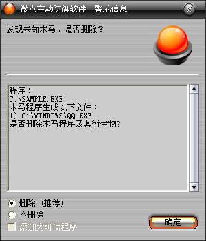 已安装使用微点主动防御软件的用户,无须任何设置,微点主动防御将自动保护您的系统免受该病毒的入侵和破坏。无论您是否已经升级到最新版本,微点主动防御都能够有效清除该病毒。如果您没有将微点主动防御软件升级到最新版,微点主动防御软件在发现该病毒后将报警提示您发现“未知木马”,请直接选择删除处理(如图1)
