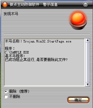 如果您已经将微点主动防御软件升级到最新版本,微点将报警提示您发现木马"Trojan.Win32.StartPage.ece”,请直接选择删除(如图2)。