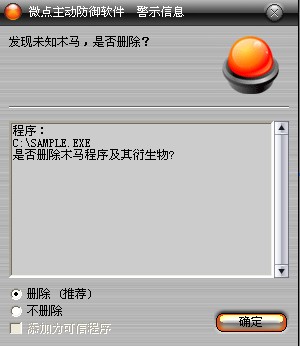已安装使用微点主动防御软件的用户,无须任何设置,微点主动防御将自动保护您的系统免受该病毒的入侵和破坏。无论您是否已经升级到最新版本,微点主动防御都能够有效清除该病毒。如果您没有将微点主动防御软件升级到最新版,微点主动防御软件在发现该病毒后将报警提示您发现“未知木马”,请直接选择删除处理(如图1)