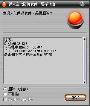 图1 微点主动防御软件自动捕获未知病毒(未升级)
