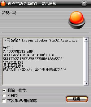 如果您已经将微点主动防御软件升级到最新版本,微点将报警提示您发现木马"Trojan-Clicker.Win32.Agent.dca”,请直接选择删除(如图2)。
