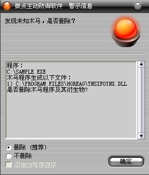 已安装使用微点主动防御软件的用户,无须任何设置,微点主动防御将自动保护您的系统免受该病毒的入侵和破坏。无论您是否已经升级到最新版本,微点主动防御都能够有效清除该病毒。如果您没有将微点主动防御软件升级到最新版,微点主动防御软件在发现该病毒后将报警提示您发现“未知木马”,请直接选择删除处理(如图1)