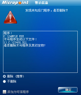 已安装使用微点主动防御软件的用户,无须任何设置,微点主动防御将自动保护您的系统免受该病毒的入侵和破坏。无论您是否已经升级到最新版本,微点主动防御都能够有效清除该病毒。如果您没有将微点主动防御软件升级到最新版,微点主动防御软件在发现该病毒后将报警提示您发现“未知后门”,请直接选择删除处理(如图1)