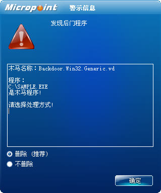如果您已经将微点主动防御软件升级到最新版本,微点将报警提示您发现木马"Backdoor.Win32.Generic.vd”,请直接选择删除(如图2)。