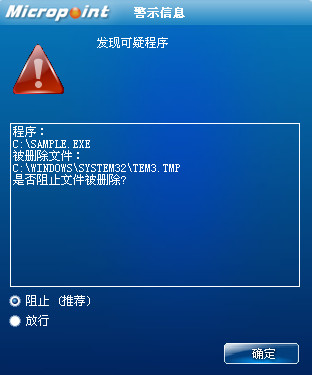 已安装使用微点主动防御软件的用户,无须任何设置,微点主动防御将自动保护您的系统免受该病毒的入侵和破坏。无论您是否已经升级到最新版本,微点主动防御都能够有效清除该病毒。如果您没有将微点主动防御软件升级到最新版,微点主动防御软件在发现该病毒后将报警提示您发现“可疑程序”,请直接选择删除处理(如图1)