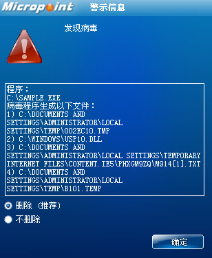 已安装使用微点主动防御软件的用户,无须任何设置,微点主动防御将自动保护您的系统免受该病毒的入侵和破坏。无论您是否已经升级到最新版本,微点主动防御都能够有效清除该病毒。如果您没有将微点主动防御软件升级到最新版,微点主动防御软件在发现该病毒后将报警提示您发现病毒,请直接选择删除处理(如图1)