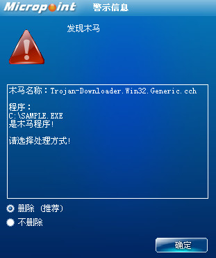 如果您已经将微点主动防御软件升级到最新版本,微点将报警提示您发现木马"Trojan-Downloader.Win32.Generic.cch”,请直接选择删除(如图2)。