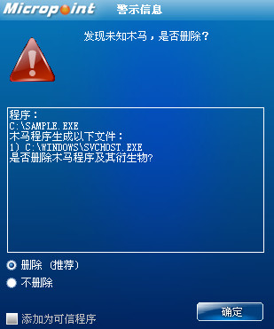 已安装使用微点主动防御软件的用户,无须任何设置,微点主动防御将自动保护您的系统免受该病毒的入侵和破坏。无论您是否已经升级到最新版本,微点主动防御都能够有效清除该病毒。如果您没有将微点主动防御软件升级到最新版,微点主动防御软件在发现该病毒后将报警提示您发现“未知木马”,请直接选择删除处理(如图1)